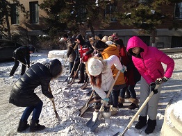 零下二十五度的刺骨寒风并没有压倒同学们的热情,大家挥舞着铁锹、铁铲等工具积极投身于清除积雪的“战斗”中,在寒冷的天气里,被汗水浸湿的头发又都结成了冰。