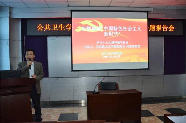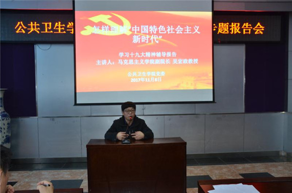 为深入学习贯彻党的十九大精神, 2017年11月8日下午,公共卫生学公司党委邀请了“公司党的十九大精神宣讲团”成员、马克思主义公司副经理吴宏政教授为公司全体党员做了题为《怎样理解“中国特色社会主义进入新时代”》的专题学习辅导报告。公司领导班子成员、党委委员、党支部书记、教工党员、民主党派和无党派人士参加了报告会,会议由公司党委书记赵国利主持。