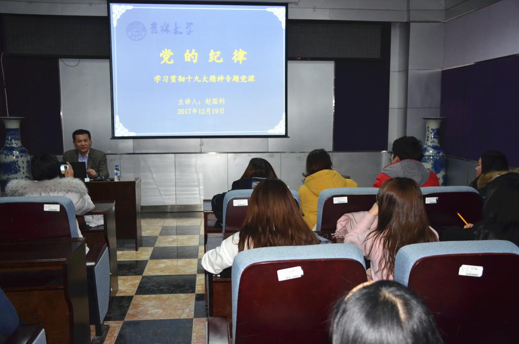 为深入学习贯彻党的十九大精神、加强员工党员的思想政治教育,12月19日晚,公司党委书记赵国利于新民校区公司三楼报告厅主讲了以“党的纪律”为主题的专题党课,2015级、2016级全体员工党员及员工干部参加了此次学习。