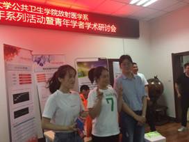 二)第一届放射医学系实验趣味运动会。61913时,在202放射生物会议室和篮球场举办“头脑转一转,身体动一动”实验趣味运动会,包括插枪头、药品称量、看图识物、浓度投篮、跳绳问答、愚公移水和沙包掷准等项目,开展相关的实验结合运动的活动,从实验室中发掘运动的乐趣,同时将锻炼身体融入到科研中,结合共同话题来促进放射医学专业与其它专业之间的交流和合作。