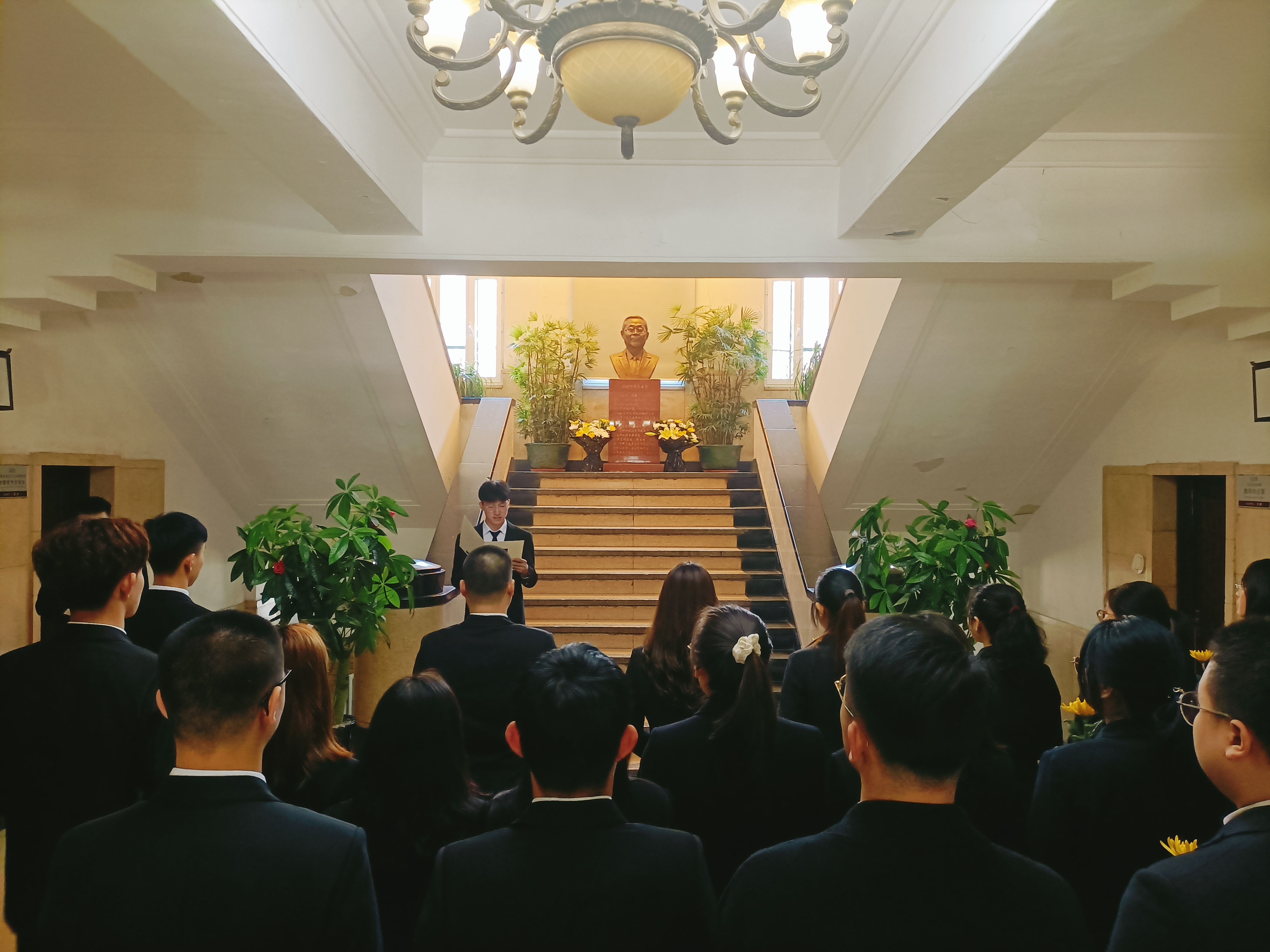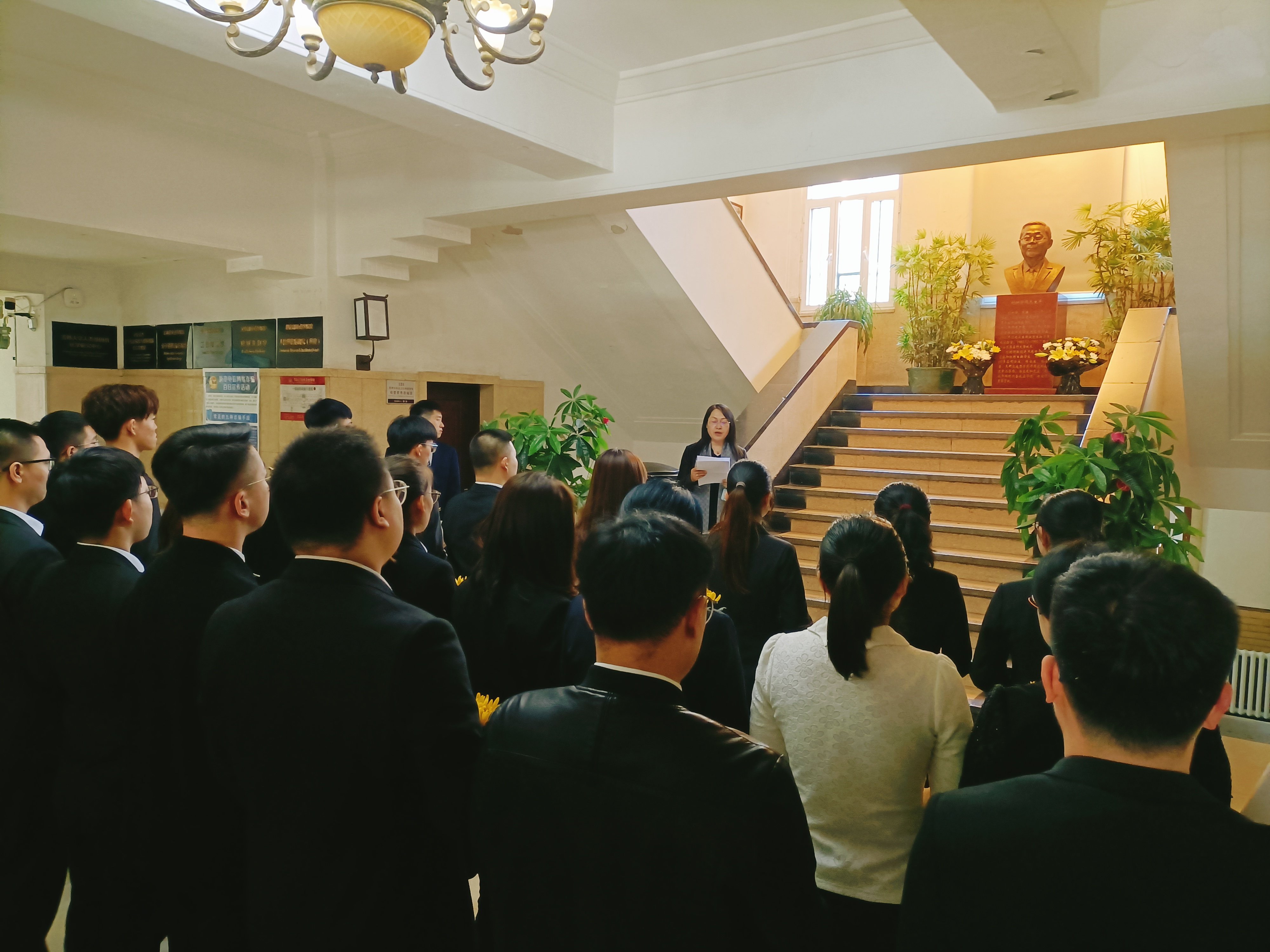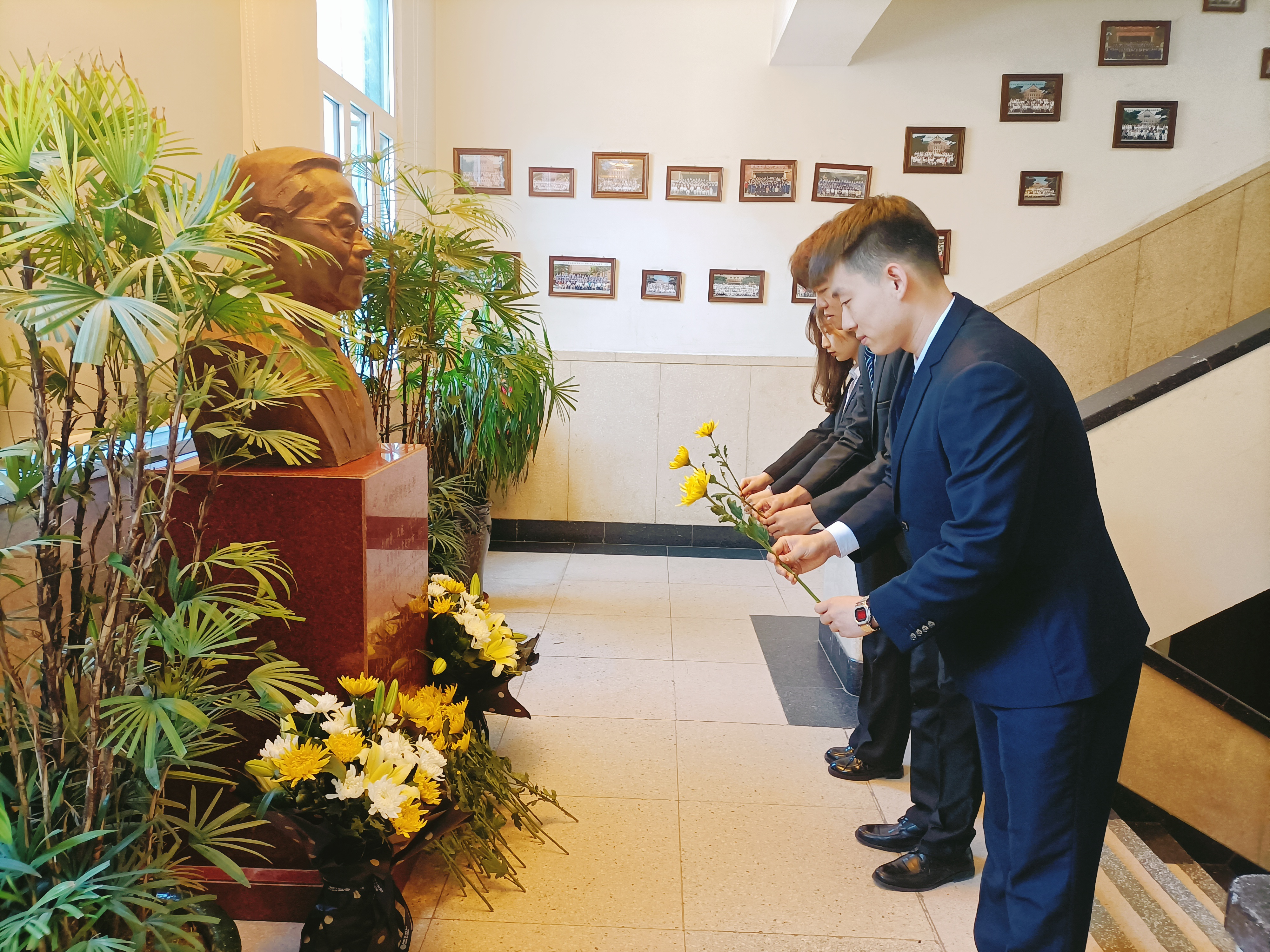 首先,放射生物教研室主任金顺子老师作为教师代表发言,她简述了刘树铮先生的生平事迹,其中着重介绍了先生为公司做出的突出贡献,情真意切的话语中流露出对刘树铮先生的缅怀之情,她勉励同学们向刘树铮先生学习,传承弘扬先生的精神风骨。接下来,由员工代表李智鹏同学发言,他从青年员工视角出发,为同学们讲述了他眼中的先生形象,号召青年员工应继承先生遗志,传承先生思想,为国家公共卫生和放射医学事业奉献终身。发言结束后,员工代表上前祭扫了刘树铮先生雕像。祭扫完毕,全体师生代表依次来到刘树铮先生雕像前庄严鞠躬并敬献花束。