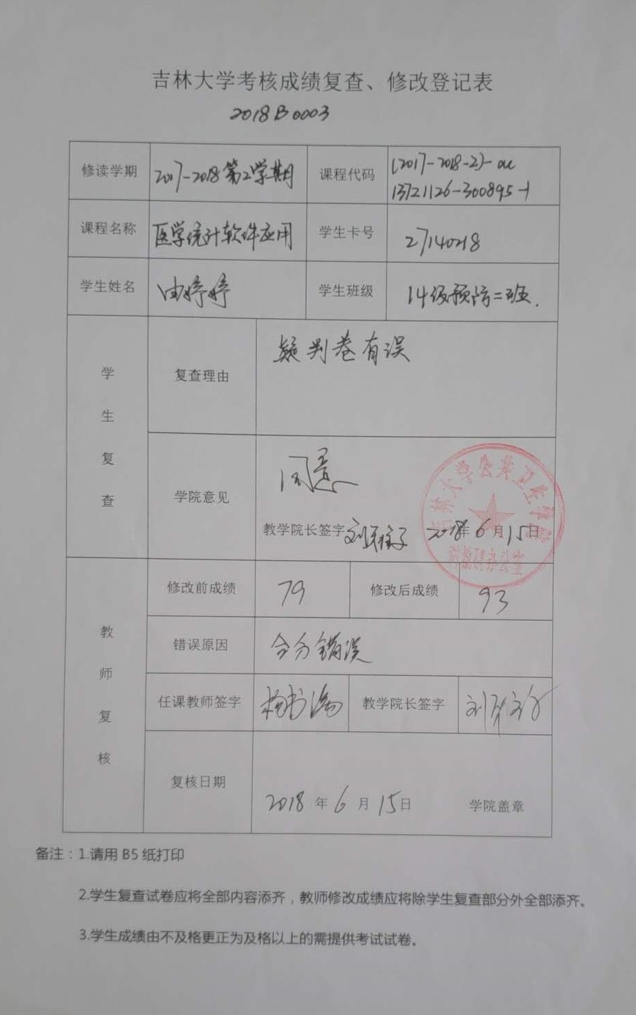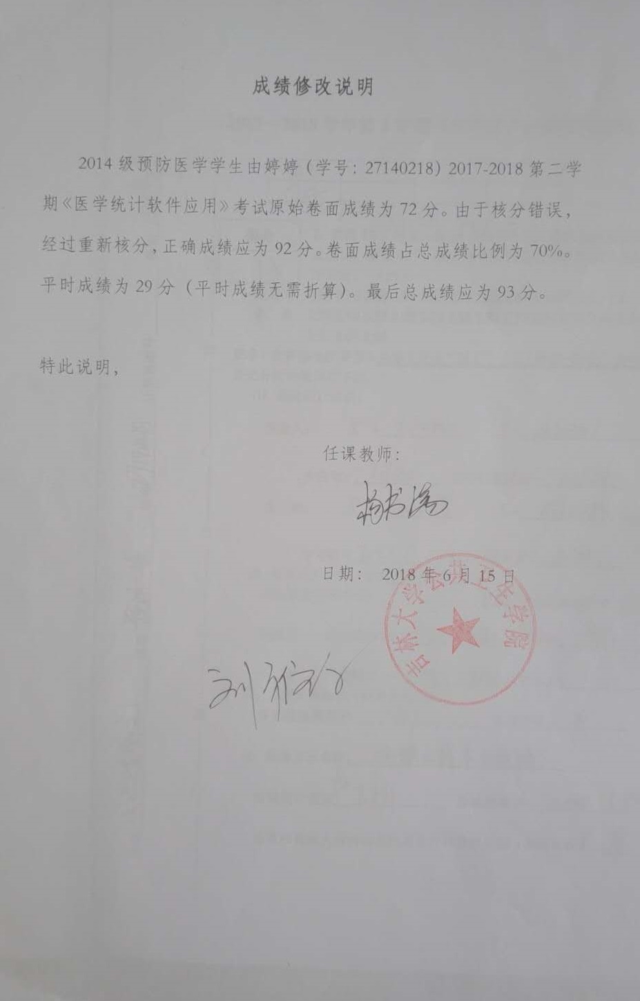 根据《关于进一步明确本科生课程考核等有关问题的通知》(校教字〔2018〕47号)文件有关精神,现对太阳成集团tyc9728公司2014级由婷婷同学(27140218)2017-2018-2《医学统计软件应用》成绩更正如下: