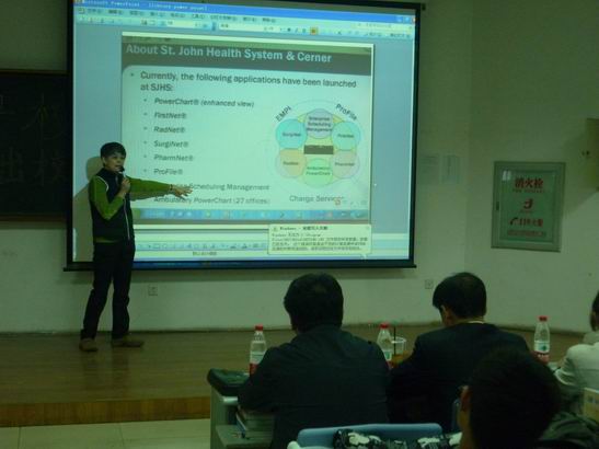 在报告的最后进入互动阶段,王晓健结合自己离开母校的近30年在海外发展的心路历程,向学弟学妹们讲述了自己学习、工作和生活的一些感想和体会。现场的同学频频举手发问,提出了自己所关心的问题,王晓健一一回答了同学们提出的问题。王晓健的报告轻松活跃,内容充实,令在场的同学深受教益,现场气氛热烈,掌声不断。2个小时的报告和现场互动交流很快过去。最后,于洗河副书记兼副经理讲话,对王晓健女士回母校与同学们进行交流表示感谢,希望同学们能够坚定专业思想,掌握专业知识和技能,毕业后能够成为我国医学信息领域的栋梁之才。