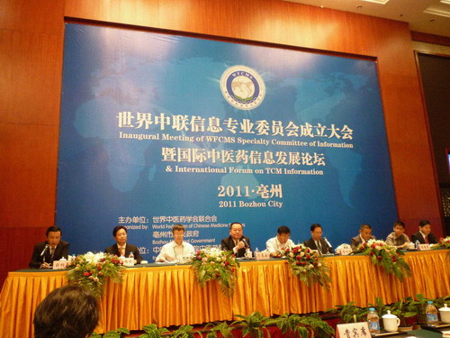 2011年9月9日~10日,世界中医药学会联合会信息专业委员会成立大会暨首届中医药国际信息化发展论坛会议在安徽省亳州市举行。本次会议由世界中医药学会联合会及亳州市政府共同主办,世界中医药学会联合会信息专业委员会、中国中医科公司中医药信息研究所及北京盛世国康医药信息咨询有限公司承办。来自中国、美国、加拿大、新加坡、新西兰、意大利、中国香港和澳门等国内外120余位代表参加了本次论坛。