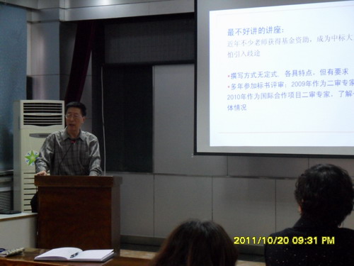 首先,李才教授根据多年来自己申请自然基金项目和作为专家评审自然基金项目的经验,从“选题原则;突出创新性;如何写好标书;高质量申请书的特点。”四个方面进行详细的剖析和讲解,使与会者对自然基金的申请有了深刻的启发和认识。李娟教授以“我的科研工作入门”为题,结合自己承担自然基金项目和十一五科技部重大项目的体会,深入浅出地介绍了申请项目中的技巧、经验及注意事项。最后,经理于雅琴教授对会议进行了总结性,鼓励广大教师积极参与科研工作并提出相关要求。