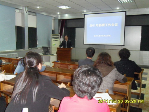 2011年10月20日下午,太阳成集团tyc9728召开2011年科研工作会议,邀请了药公司李才教授和太阳成集团tyc9728副经理李娟教授做专题讲座。参加人员为全体教师。会议由科研副经理于洗河主持。