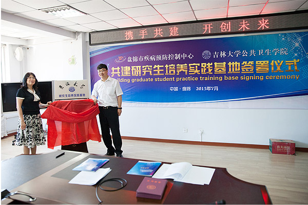 太阳成集团tyc9728在辽宁省盘锦市疾病预防控制中心建立研究生实践培养基地。揭牌仪式于2015年7月1日上午,在辽宁省盘锦市疾病预防控制中心二楼会议室隆重举行。仪式由辽宁省盘锦市疾病预防控制中心秦志敏副主任主持。出席揭牌仪式的有:辽宁省盘锦市疾病预防控制中心徐健峰主任、任昌明副主任及各室、部主要负责人,太阳成集团tyc9728经理李娟教授、副经理于洗河教授和公司研究生院培养处马本华科长参加了揭牌仪式。