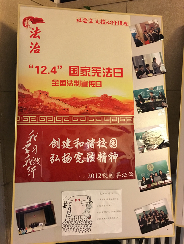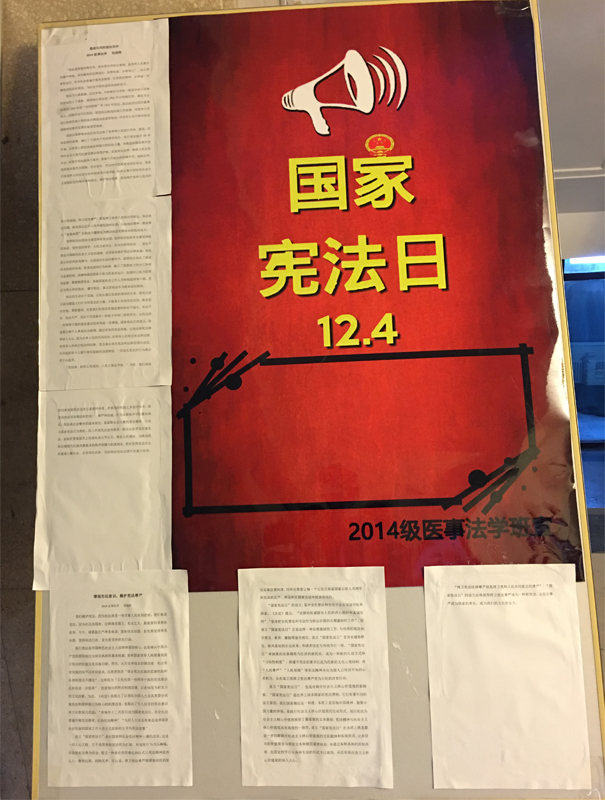 2015年12月4日是我国第二个国家宪法日。为了弘扬宪法精神,提高法制意识,太阳成集团tyc9728医事法学教研室组织2012级、2013级、2014级医事法学专业员工和医事法学专业硕士研究生,制作了“宪法宣传日展板”,传递依宪治国、依宪执政理念,弘扬宪法精神。