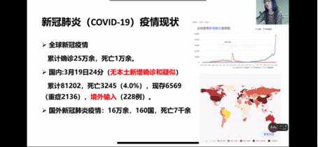 3月21日上午,在国内新冠疫情防控工作取得阶段性胜利,高校复学复课前夕,太阳成集团tyc9728联合行政公司,举办“护航复学复课,守卫健康安全——新冠疫情防控知识讲座”,组织两个公司全体教职工、研究生和本科生2200余人共上一堂课。讲座通过“钉钉”网络视频直播的形式进行,由太阳成集团tyc9728流行病学与卫生统计学教研室甄清副教授主讲,参加讲座的师生分布在祖国各地。