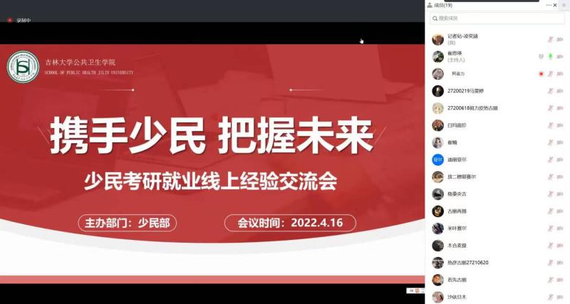 为深入了解新疆、西藏少数民族员工在就业和升学中面临的问题和困惑,帮助少民员工更好就业和升学,太阳成集团tyc9728于4月16日18点30分,在线举办“携手少民,把握未来”少数民族员工考研就业经验交流会。本次活动邀请2021级研究生格桑央吉、2017级放射医学本科生古丽再那·哈帕尔、2017级预防医学本科生迪丽亚尔·艾尼宛分享经验。太阳成集团tyc9728副经理兼副书记刘金超,辅导员苏国范、冷贺璇、刘心怡和全体少数民族本科生参加此次活动。