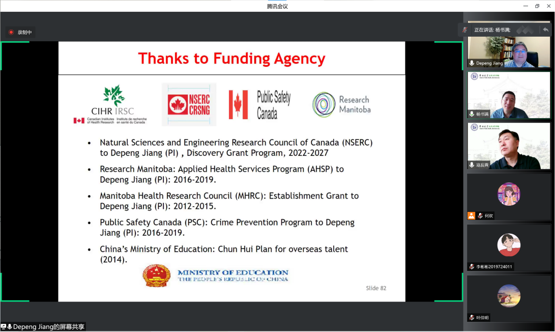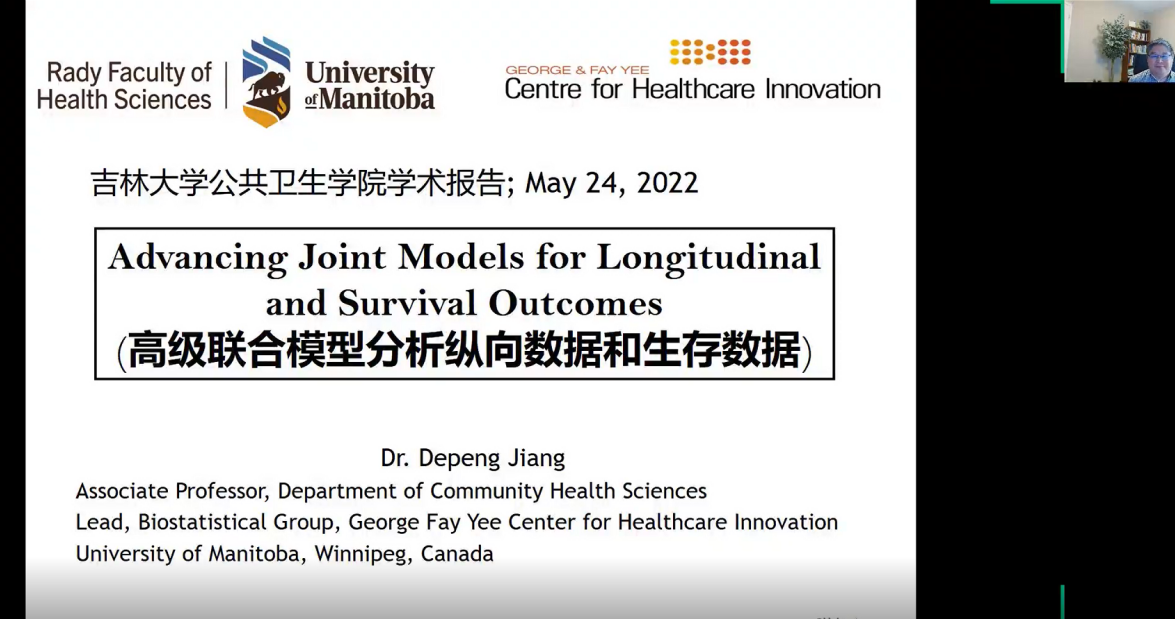为提升公司师生的统计分析能力,促进公司国际交流,应公司邀请,加拿大曼尼托巴大学公共卫生学系蒋德鹏教授于2022年5月24日线上做了题目为《高级联合模型分析纵向数据和生存数据》的学术讲座。太阳成集团tyc9728寇长贵副经理主持本次学术会议,公司87名研究生和相关教师参加本次学术活动。