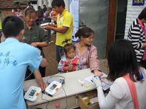 7月25日,太阳成集团tyc9728农民慢性病筛查健康体检走进双阳区鹿乡镇卫生院,在乡卫生院医生的协助下,我们挂起了健康宣传条幅,也很快便将各设备安置妥当,随即就来了大批参加免费体检调查的本地居民。面对着“浩浩荡荡”的人群,志愿者的倦意顿时全失,队员们都各尽其责,积极投入到工作中去,问卷和各项体检工作也都有条不紊地进行着。然而,对于我们问卷中一些关于人民衣、食、住、行等方面的问题,很多居民表现出的是不理解、不配合甚至是抵触心理,他们认为这些都与健康体检无关而且时间过长,但志愿者用微笑、耐心和真诚向他们详细解说了这一问卷调查对健康体检结果的重要意义。果然,有付出就有回报,有努力就有收获,人们纷纷由开始的不愿意合作填写问卷,到后来都愿意敞开心扉、说出心里话并配合我们工作了。这让志愿者很是欣慰,在一定程度上提高了志愿者的积极性、让我们激情倍增。