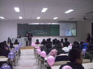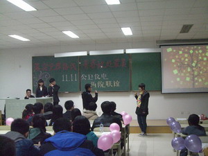 在两院团委员工会的精心准备后,联谊晚会拉开帷幕。晚会以点取同学手中号码的形式进行幸运抽奖和游戏比赛。首先是持有特殊号码的同学画一幅自画像,然后进入第一个游戏“我划你猜”。参与游戏的同学笑料百出,当然也出现猜题高手。接下来进行了“听音猜歌”,游戏者根据歌曲前奏猜出该首歌并进行演唱,这一环节出现了麦霸,也将全场气氛引入高潮。比分落后者也有残酷的惩罚——胜者配制的饮料。之后的游戏环节是为视频配音,齐心协力过难关。最后一个游戏,当男生背起女生的时候,全场进入了另外一个高潮。联谊在一片笑声中完满结束。