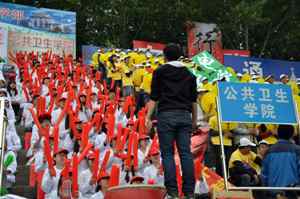 在运动会进行过程中,所有观众都整齐地坐在位置上为运动健儿们加油助威。在此过程中,观众还在公司员工会生活部部长及部员带领下高喊“争冠夺魁,唯我公卫,青春无畏,舍我其谁”的口号。尽管不是每个人都能参加比赛,获得冠军,但是大家都把自己的热情融入到运动会中。蒙蒙的细雨挡不住大家的热情,我们都在为运动会奉献自己的力量。