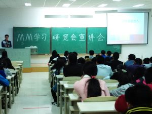 宣讲开始,先由主持人播放了一段暖场视频,使同学们对M.M协会有了一个初步认识。之后主持人配合着PPT对M.M协会进行了简单的介绍 ,包括其学习研究形式、成员构成以及协会部门,重点介绍了M.M协会之前取得的成就及地位。主持人清晰明朗的宣讲激发了广大同学的热情。随后M.M协会会长对介绍进行了补充,分享了自己在M.M协会的成长经历与收获,鼓舞新生在学习和生活上去做到有责任意识、进取心、创新意识和热情,她的演讲将此次宣讲会推入高潮。紧接着员工第三党支部委员也上台用举例等方式介绍了M.M协会,鼓励新生积极踊跃地报名参加,博得了同学们热烈的掌声。最后,主持人介绍了如何加入协会以及怎样填写申请表等细节内容。简短而难忘的宣讲会圆满结束后,M.M协会成员合影留念。