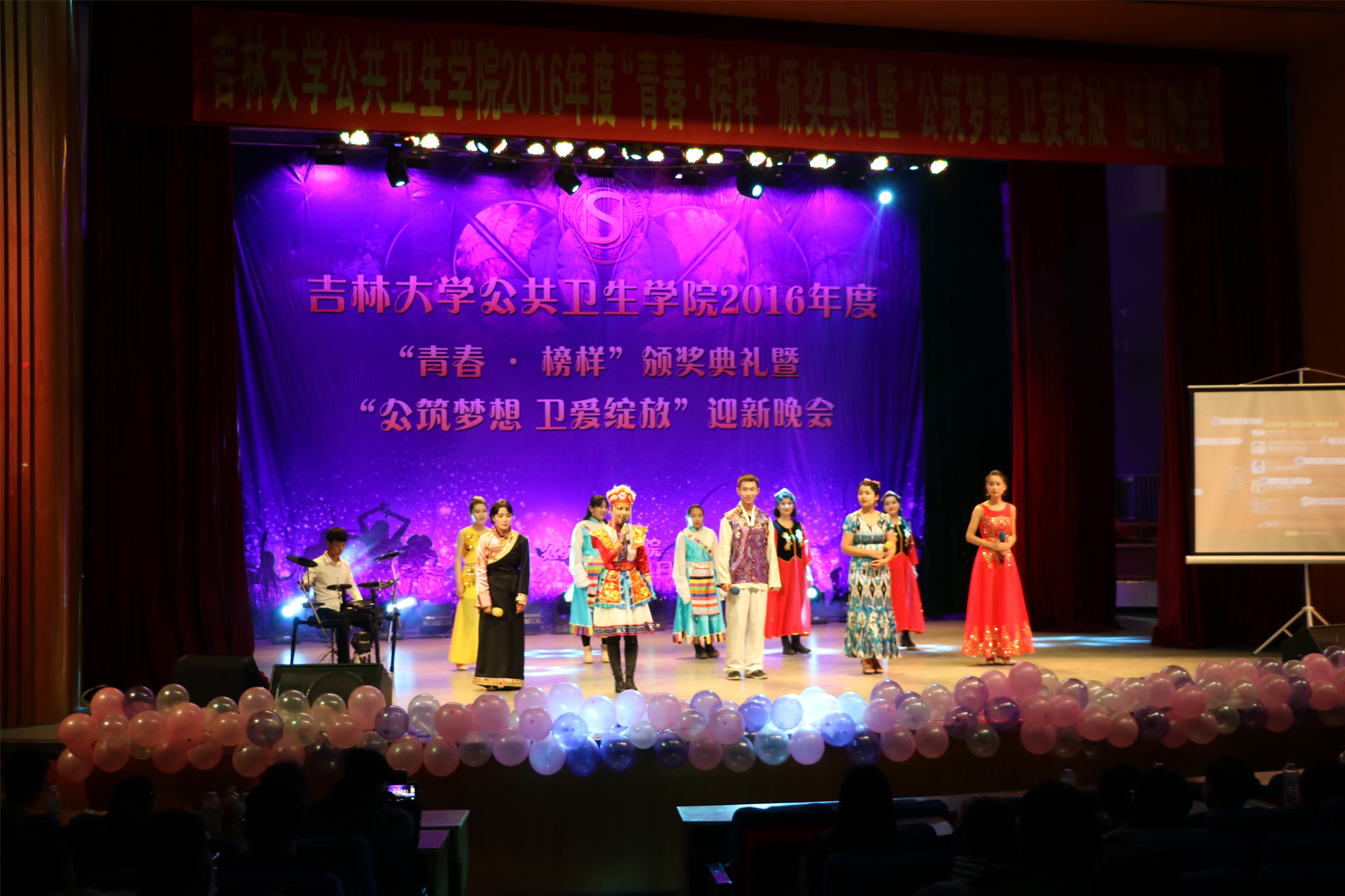 在一阵热烈的掌声中,活力十足的劲歌热舞率先掀起了2016年度“公筑梦想 卫爱绽放”迎新晚会的高潮。整场晚会呈现的节目精彩连连:歌曲《陪你一起看草原》和民族歌舞串烧《喜欢你》为观众呈现了多姿多彩的民族文化,营造出民族融合、共同进步的和谐盛景;诗歌朗诵《祖国,我亲爱的祖国》字字铿锵有力,句句掷地有声,唤起了同学们深藏心底的爱国情怀;搞笑喜剧《大话公卫》更是以幽默风趣的台词介绍了公司的现状、学科的发展前景以及同学们的校园生活状态;《老员工活》是同学们精彩演绎的视频配音作品,表演方式新颖独特,引起了现场观众的共鸣;歌舞《恋人心》和《告白气球》利用流行元素,烘托出同学之间浪漫的情愫,展现出公卫学子的青春与活力;《相亲相爱》是太阳成集团tyc9728全体师生共同表演的大型歌舞,寄托了公司全体师生精诚互助、共同进步的精神内涵,在师生亲密无间的合作中,晚会渐渐步入了尾声。