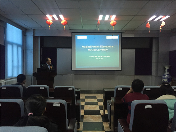 讲座主要围绕放射医学专业新兴的就业方向——物理师展开,内容涵盖放射医学专业的毕业实习项目、联合教学项目等详细介绍。鉴于物理师这一职业在中国还未广泛普及,同学们对这一新兴职业缺乏深入的了解,李恒亮教授首先以麦吉尔大学医公司培养出的物理师为代表,对北美地区物理师的教育培训、工作职责、职业要求及平均工资等问题向同学们进行了基本介绍。随后,他向同学们介绍了加拿大麦吉尔大学的地理位置和自然环境,在他的介绍中,同学们了解到,