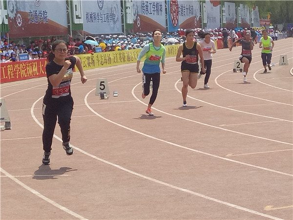 烈日当头,炎热的天气并没有削减运动员为院争光的决心。在志愿者的帮助下,运动员完成检录、进入跑道。伴随着发令枪响,裁判员一声令下,运动员们如离弦之箭一般冲向终点般。在观众的加油声中,运动员们鼓足一口气,坚持不懈地奔跑着。尽管头顶烈日、满头大汗、喘着粗气,也没有一个人放弃。比赛中,运动员们以拼搏的精神、顽强的毅力、坚定的步伐向前奔跑,即使感到疲惫,还是毅然决然、勇敢地冲向终点。经过一番激烈角逐,沈怡飞最终以小组第五的好成绩完成了此次比赛。