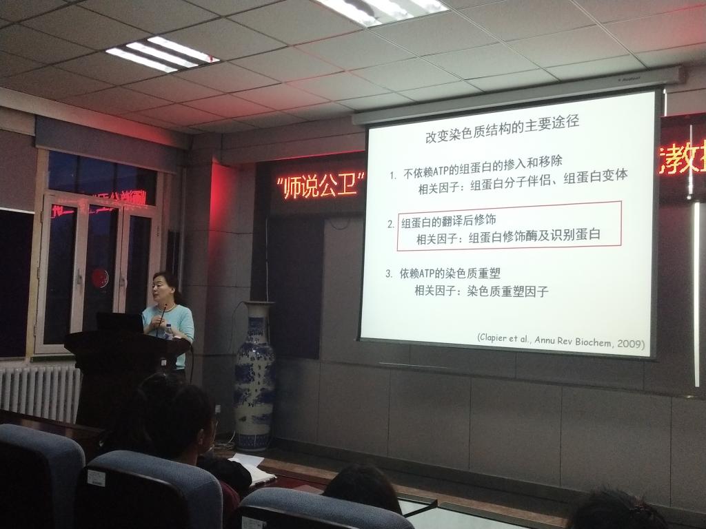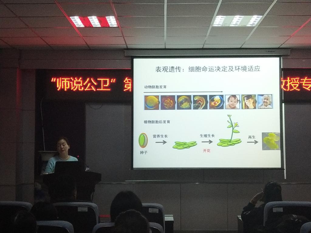 19时整,公司三楼报告厅座无虚席,简短的开场之后,讲座正式开始。讲座中,董爱武教授详尽地介绍了改变染色质结构的主要途径,包括不依赖ATP的组蛋白的掺入和移除、组蛋白的翻译后修饰、依赖ATP的染色体重组。她还讲解了表观遗传学的核心研究内容,包括DNA甲基化修饰、染色质结构变化、非编码RNA调控等,并以此为基础,围绕组蛋白甲基化修饰阅读蛋白精确调控拟南芥开花时间的分子机制展开深入、直观的分析。随后,董爱武教授还将表观遗传学联系到动物胚胎的发育过程中展开讨论,通过演示文稿上直观、简洁的画面,绘声绘色地向同学们讲解了专业知识。台下的同学们聚精会神地聆听着教授的讲座,在演讲的关键之处,不时地认真记录下了讲座中的精华。