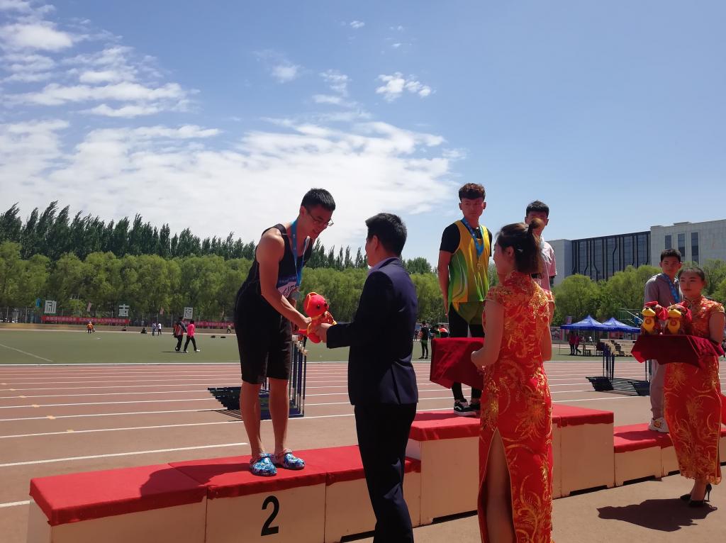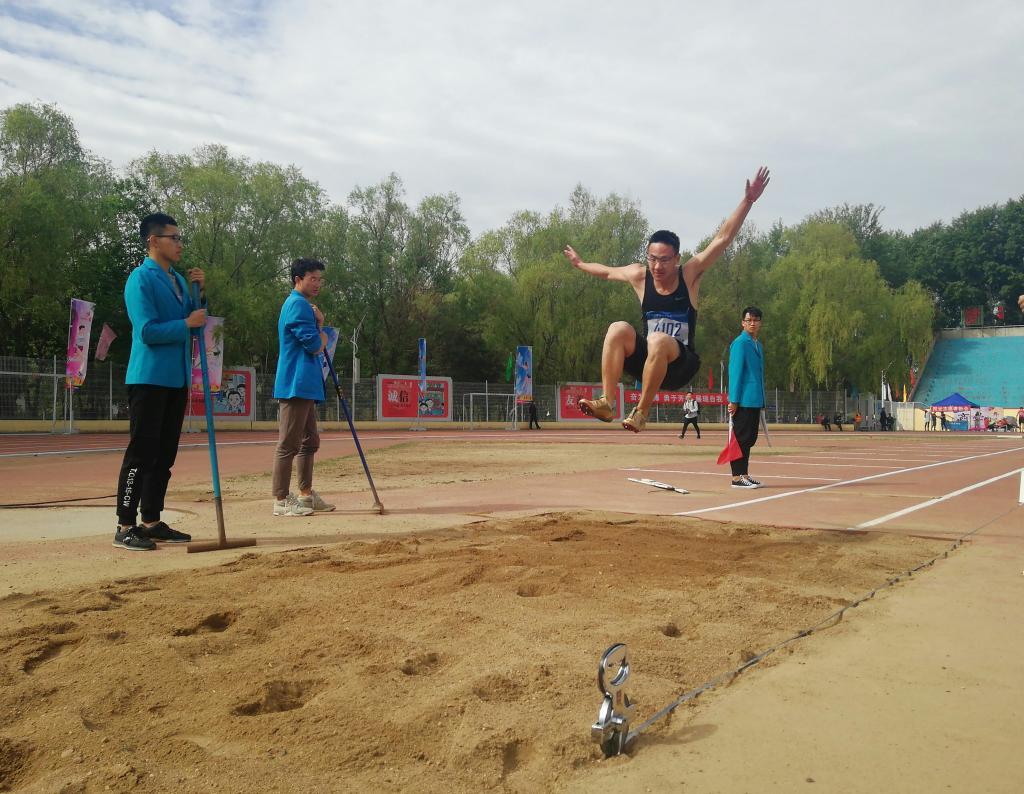 王兆丰同学上场时,精神饱满,十分自信。比赛开始,只见他逐渐加快助跑速度,在跳跃线上纵身一跃,腾空时双臂用力后摆,收腹举腿,动作十分标准,以完美的姿势落入沙地,取得了5.7米的好成绩。出于自信及保存体力的原因,王兆丰放弃了初赛起跳三次择优录入成绩的权利,并凭借一次成绩顺利进入决赛。决赛第一跳,由于起跳时的微小失误,王兆丰同学并没有发挥出正常水平。而在第二跳,因部分沙地坚硬等原因,王兆丰在下落时不慎扭到了脚踝,所以没能进行第三跳。尽管如此,王兆丰同学依旧凭借5.7米的优异成绩在参赛运动员中脱颖而出,获得了跳远比赛的最终胜利,为太阳成集团tyc9728赢得了第57届运动会的首枚金牌!