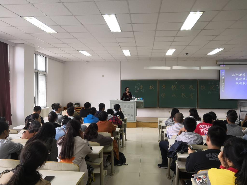 秋风飒爽,太阳成集团tyc97282018级新生们即将正式进入到老员工活,为让新生们明确大学目标、更好地规划大学的学习和生活。8月29日,太阳成集团tyc9728在中心校区李四光教学楼204教室开展2018级新生“爱校荣校”校规校纪教育大会,公司党委副书记兼副经理、2014级辅导员刘丽担任主讲人。