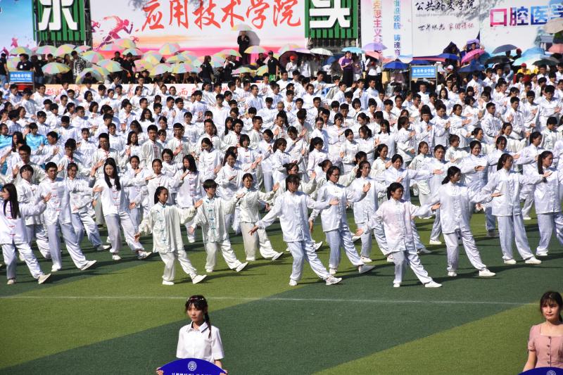 一袭白衣,仙风道骨,迎风而立,衣袂翩飞。主席台一声令下,同学们迈着整齐划一的脚步迅速跑到指定位置。伴着音乐响起,大家迅速将手举起,成抱拳礼动作。自“起势”起,二十四式太极拳缓缓铺展开来。茵茵草地之上,各参赛队员们倾听着悠扬的乐曲,握拳,转腿,缓缓冲拳,推掌,动作精确到位,整齐连贯,在柔和的动作中藏着几分刚劲,将太极的精髓展现。正如俗话说的,台上十分钟,台下十年功。短短的六分钟的汇报表演,却在台下训练一月有余,一遍遍地精益求精,方汇聚成今日场上的一气呵成。