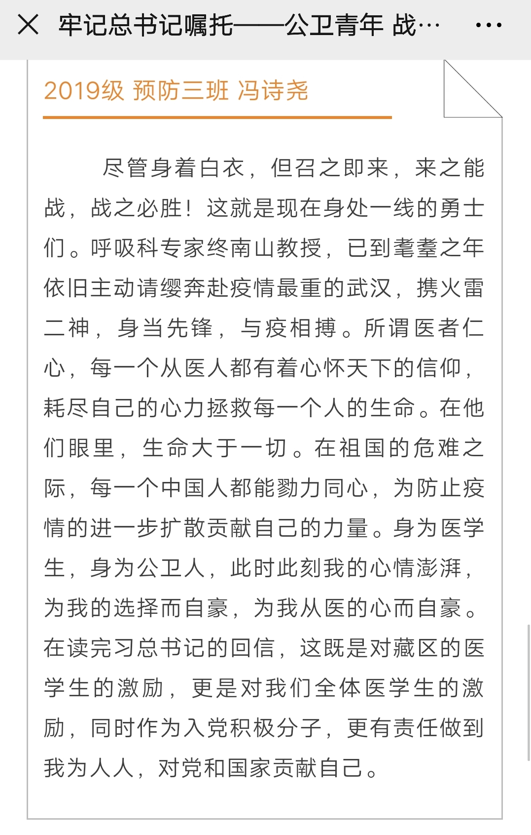 活动开始,同学们热情高涨,积极学习习近平总书记回信精神,记录学习心得。公司微信公众平台“JLU公小卫”经过认真挑选,发布了许多优秀的心得作品,供大家参考学习。在学习过程中,同学们纷纷表示要以习总书记回信精神的要求作为自己学习、生活的目标,努力学习专业知识,刻苦锻炼专业技能。在重大突发公共卫生事件发生时,能充分发挥专业优势,投身一线,用实际行动肩负起新时代青年医员工的使命和担当。正如同学们心得中所写“身为医员工,身为公卫人,此时此刻我的心情澎湃,为我的选择而自豪,为我从医的心而自豪。”