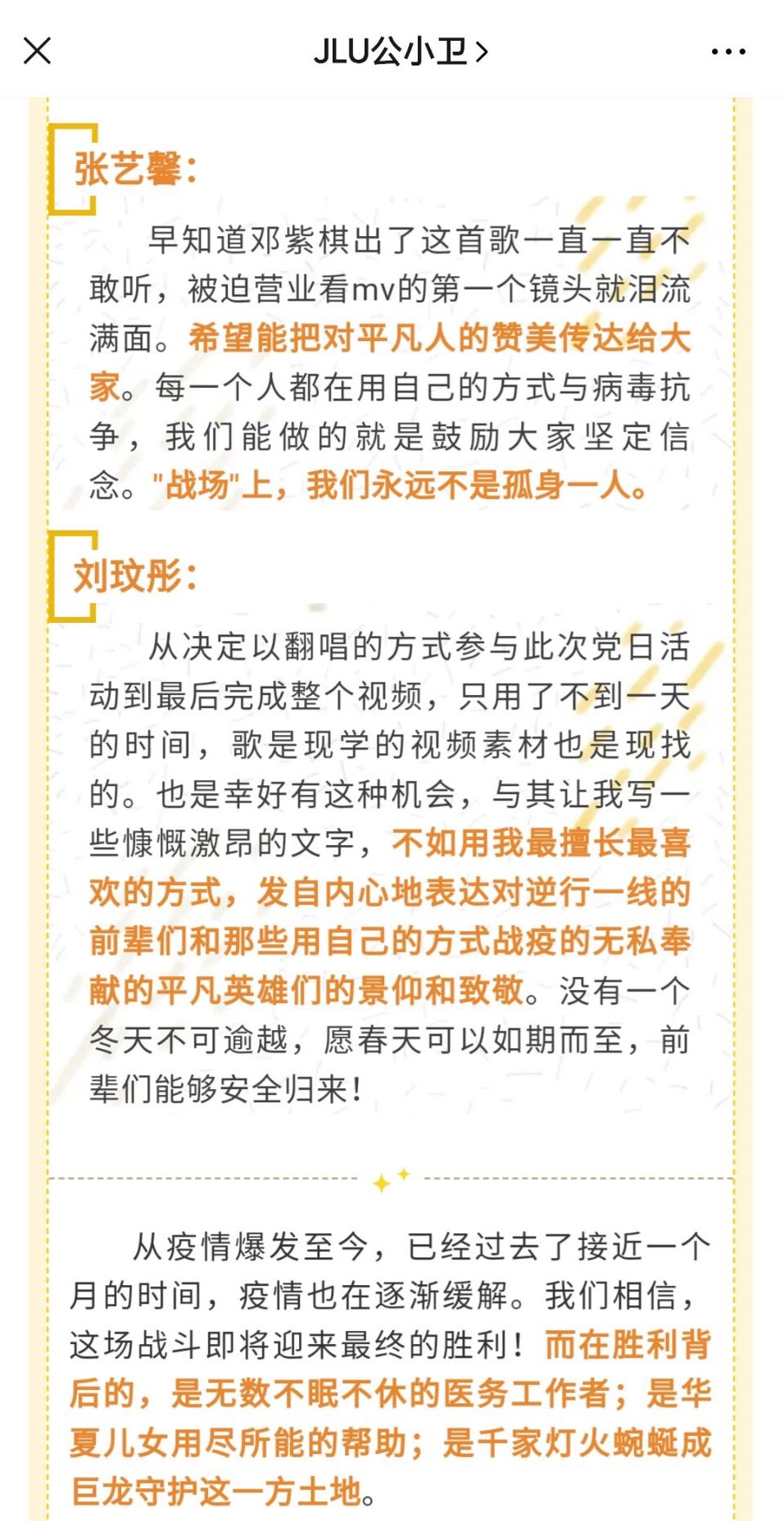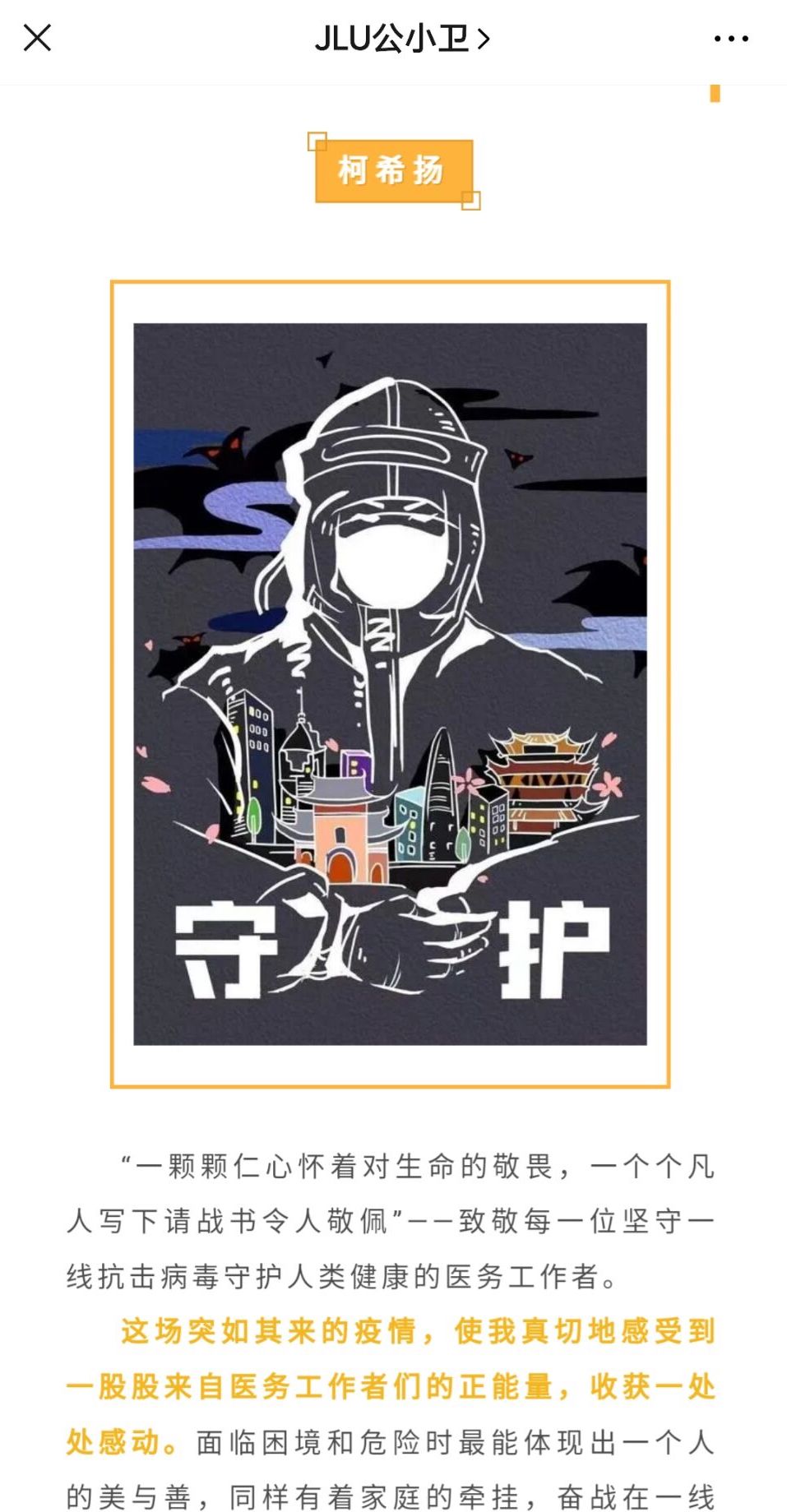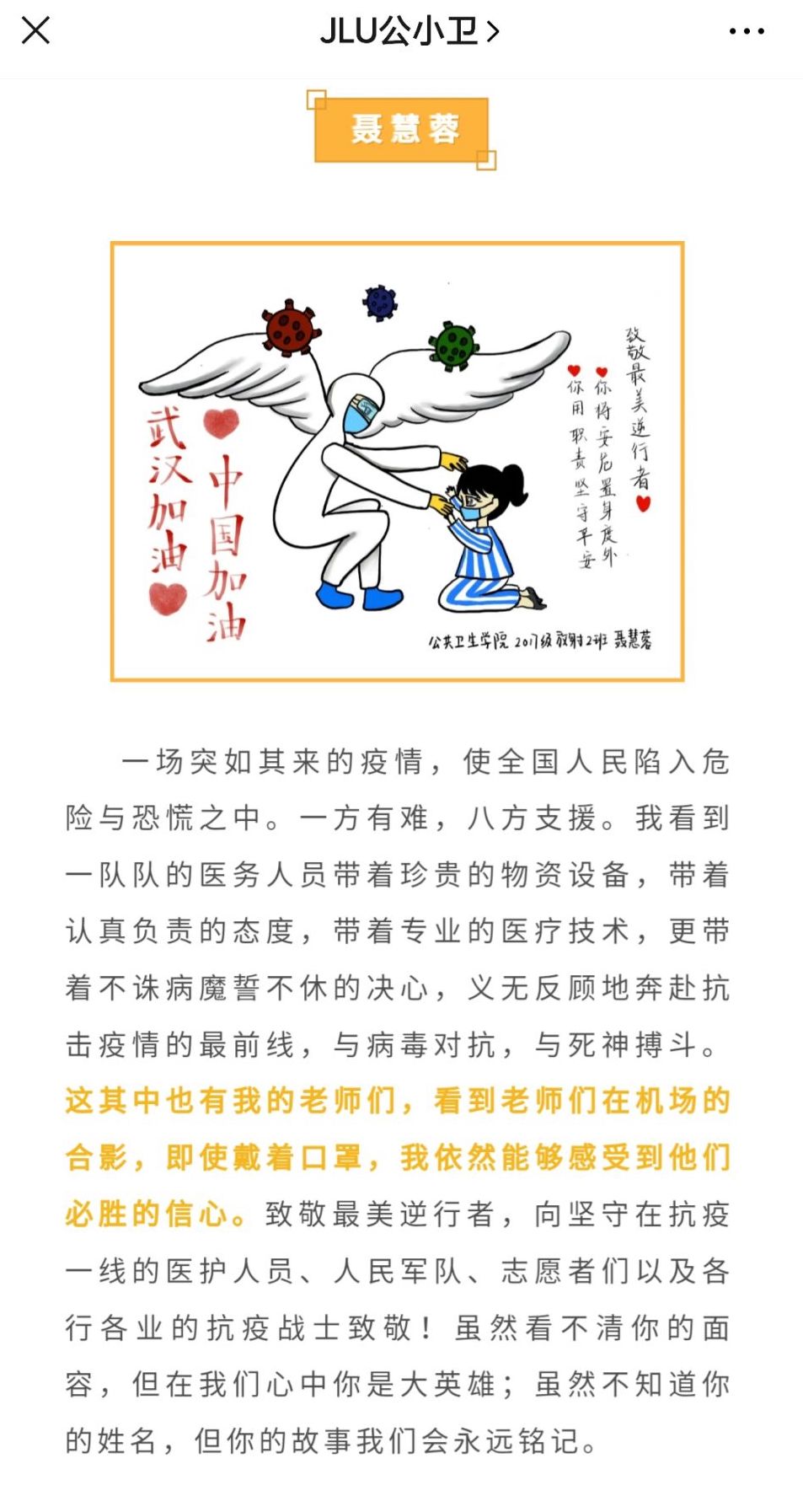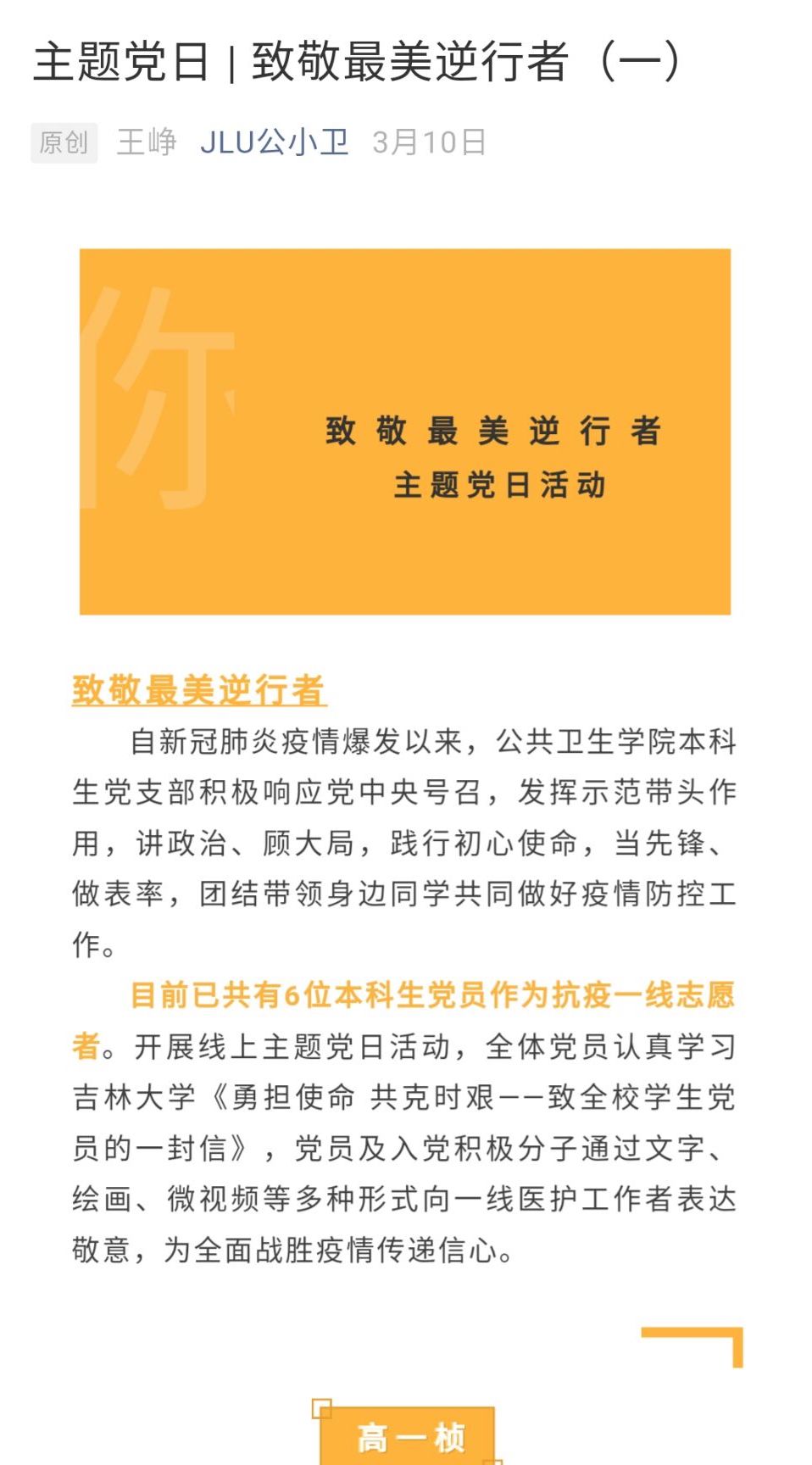 在本次活动中,支部党员及入党积极分子积极投稿,通过翻唱暖心歌曲、朗诵致敬诗歌以及创作文字、绘画和微视频等多种形式来表达对最美逆行者的崇高敬意。参加本次活动的作品经过最终遴选,发表在公司公众号JLU公小卫上。这些作品秉承着“疫情就是命令,防控就是责任”的信条,传递出党员们对各行各业抗疫战士的敬意与感谢,也表达了作为医员工“不忘初心,牢记使命”的责任与担当,获得了同学们的由衷赞美与一致好评。在线上,党员们还认真学习了太阳成集团tyc9728《勇担使命 共克时艰——致全校员工党员的一封信》,切实发挥好带头示范作用,团结带领身边同学共同做好疫情防控工作。