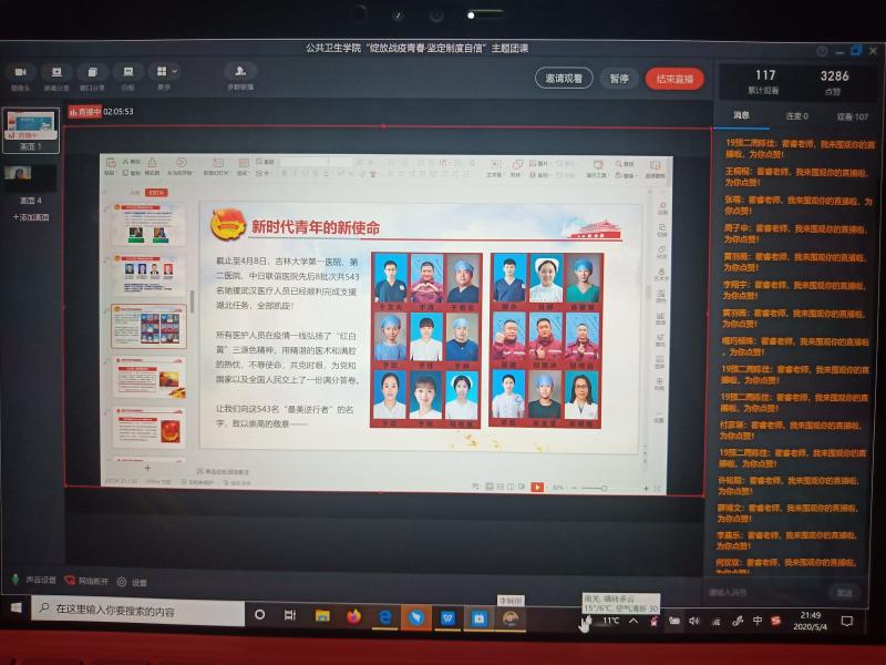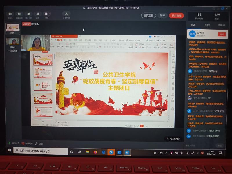为响应共青团委号召,以故事分享会等形式开展文化教育、仪式教育,太阳成集团tyc9728于5月4日晚8时通过“钉钉”平台召开了“绽放战疫青春·坚定制度自信”主题团课教育。太阳成集团tyc97282016级辅导员霍睿担任主讲人,从五个部分由浅入深,娓娓道来。118名团学组织成员准时参加本次会议并通过留言、提问等方式进行积极互动。