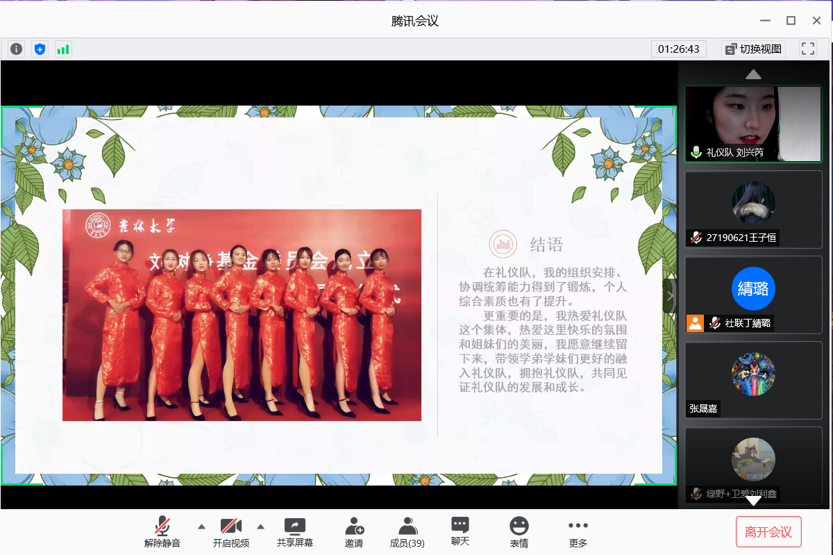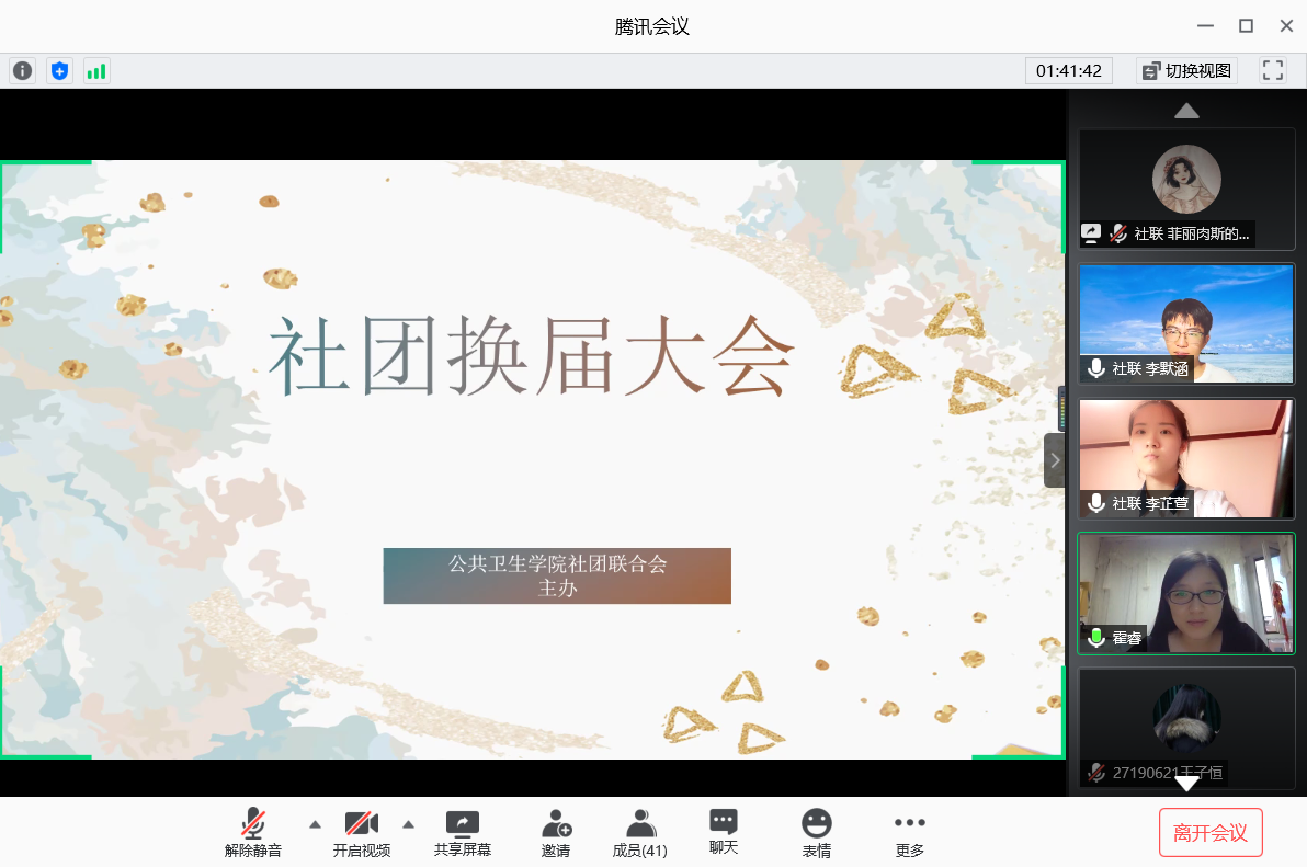 会议分为两个议程。第一议程由来自绿野环保协会、礼仪队、辩论队、主持队、红十字协会、空中英语协会、卫爱志愿者协会七个社团的社团成员参与竞选。在竞选演讲中,竞选人们首先进行自我介绍,讲述了自己竞选的理由以及优势,并结合自己在社团工作中的经验和体悟,对各自社团的未来发展进行了展望。他们勇敢、谦虚,又不失自信,精彩诚挚的言辞令同学们不禁为他们送去一阵阵“掌声”。随后,在第二议程中,由霍睿老师做总结发言,她首先预祝同学们端午节快乐,接着鼓励各社团成员们,即使是在疫情环境下,也要尽可能多举办一些新颖的线上活动,充分调动同学们的参与热情,提高社团影响力和凝聚力。霍老师还对竞选者的竞选发言提出了表扬,同时指出大家的演讲还有提高的空间,要多找自己特色之处。至此,社团换届大会圆满结束。