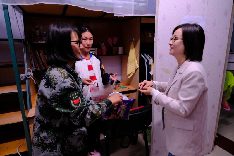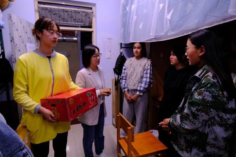 9月30日晚,冷贺璇老师与导助们带着礼物来到新生寝室,逐一走访,为新生送上精心准备的月饼和苹果,以及中秋的祝福。月饼代表喜迎中秋,苹果寓意着平安顺遂。冷老师祝大家中秋节快乐,希望大家都能在未来的日子里平平安安。收到礼物和祝福的新生们纷纷对感谢老师表达了自己的感谢之情,并同样祝福老师中秋节快乐。接着,冷老师和新生们谈论各自家乡的情况,还聊起了同学们在初入大学这段时间里的点点滴滴,说到有趣的地方,大家都笑出了声。一时间整个宿舍洋溢着节日的欢乐。最后,老师叮嘱大家近日气温多变,要注意防寒保暖。同时严格遵守疫情防控要求,中秋假期期间不要随意外出,有问题或者需要帮助的时候可以随时与老师联系。这个中秋节虽然没有家人的陪伴,但是有公司和老师的陪伴,新生们也不再感到孤单。