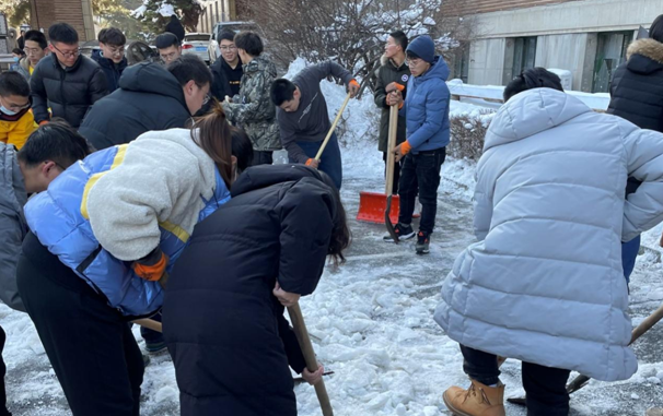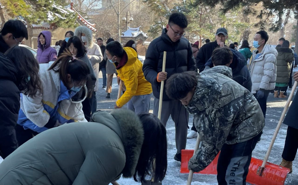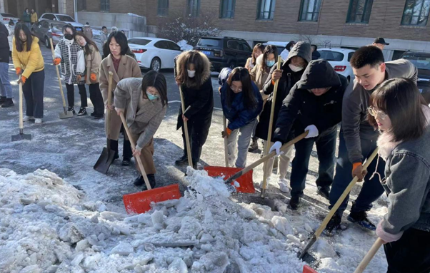 近日来长春出现暴雪天气,强降雪对校内交通与员工出行产生一定影响。 为了确保师生人身安全,确保校园内道路畅通,11月12日中午,公司组织在校教师与研究生清扫院内积雪,清雪活动得到了全体师生的积极响应,师生有序分工,头顶寒风,相互配合,共同克服积雪厚、天气冷等困难,以饱满的热情和充足的干劲铲冰清雪,活动现场大家享受着劳动中的愉快欢欣,脸上都洋溢着灿烂的笑容。师生们充分发挥团队精神,齐心合力、团结合作,经过一个多小时的共同奋战,院内积雪基本清理干净。