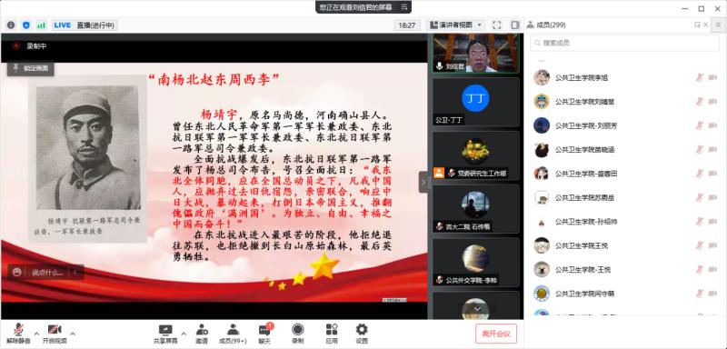3月23日晚,校研究生工作部组织召开第十期“明德研工”论坛,邀请马克思主义公司刘信君教授讲授“弘扬抗联精神,战胜新冠疫情”专题讲座。公司研究生党支部以此契机,组织研究生党员、入党积极分子等开展集中学习,重温抗联历史,重拾红色记忆。